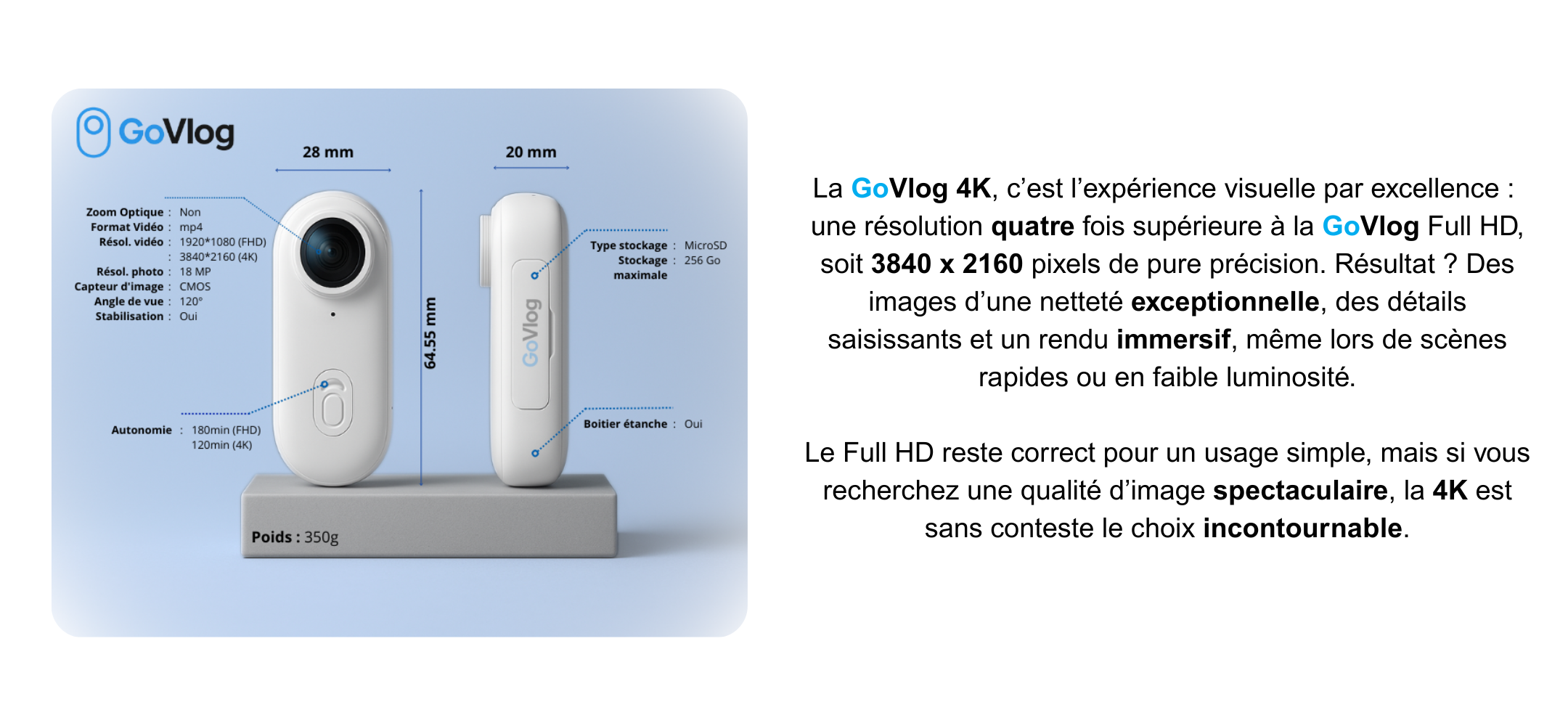 The GoVlog, c’est l’alliance de la liberté de mouvement, de la discrétion et d’une immersion totale. Capturez vos souvenirs sans contrainte et revivez-les comme si vous y étiez !